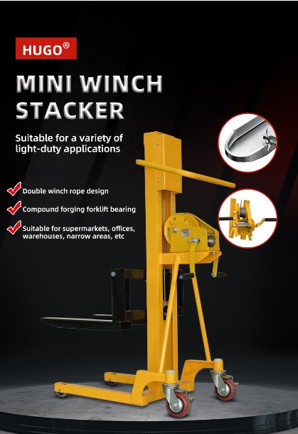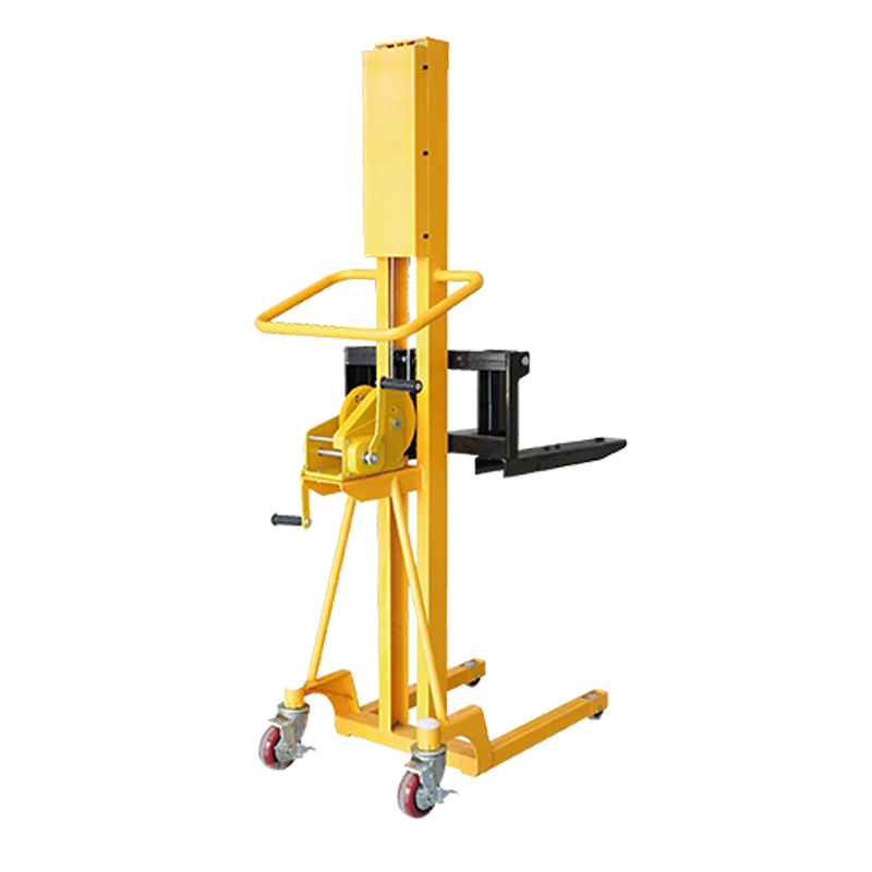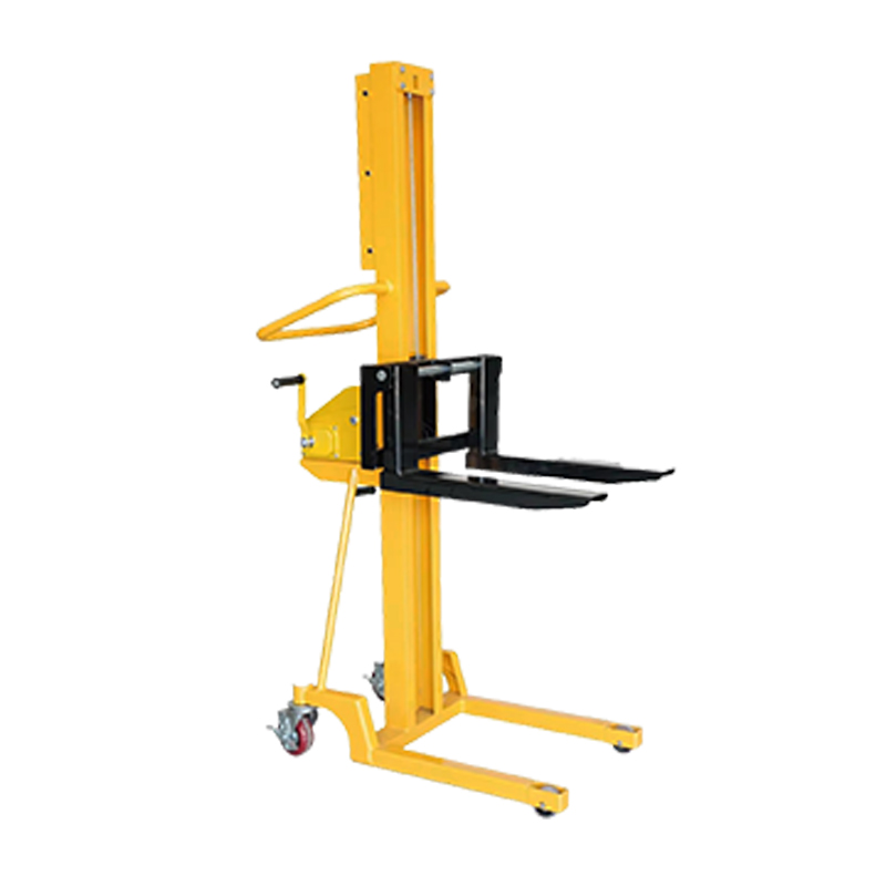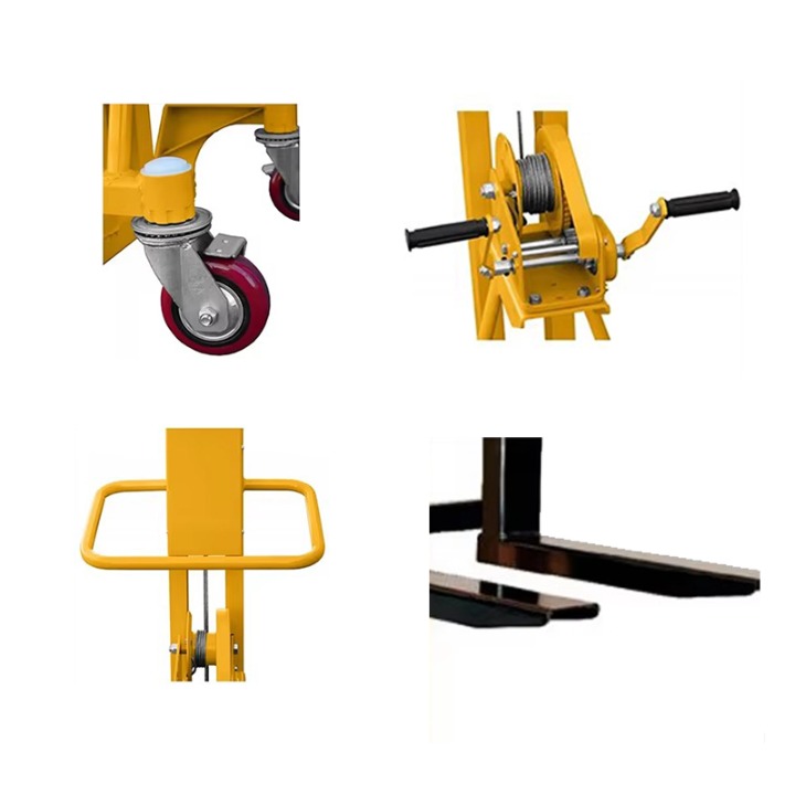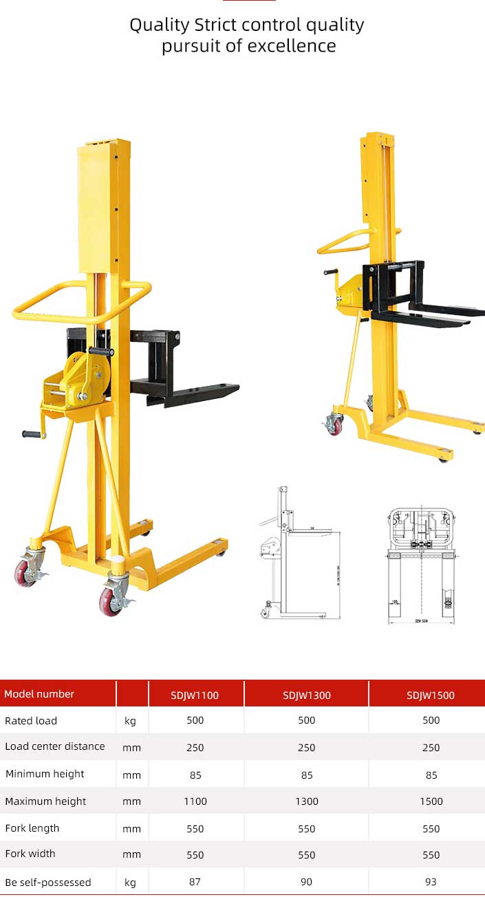 500 kg håndpall Stakcer Ved å rotere håndenheten driver operatøren den interne mekaniske strukturen for å heve eller senke lastegaffelen, og dermed oppnå stablingsoperasjonen til stableren.
